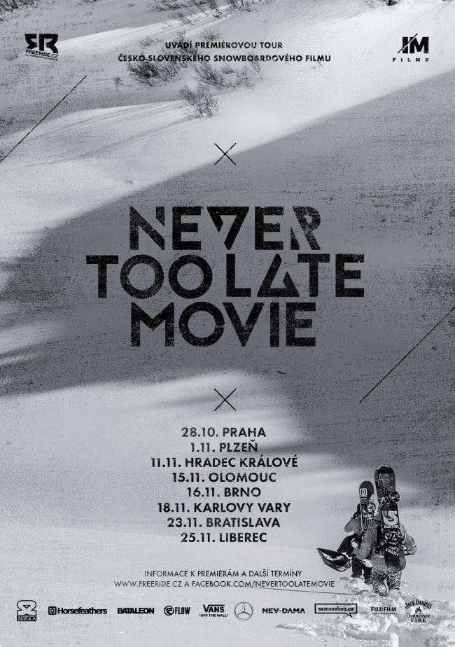 Jednáme ale i o dalších zastávkách v České republice i na Slovensku. Pro aktuální info sleduj facebook Never Too Late movie nebo www.freeride.cz.