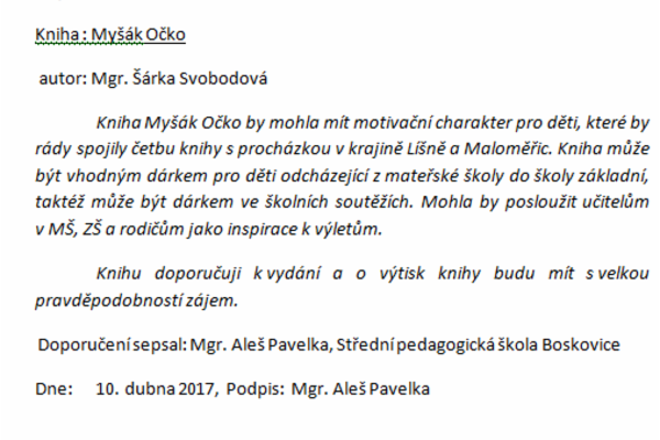 Mým cílem je motivovat děti k trávení volného času četbou zábavné knihy v zajímavých brněnských lokalitách (cestování po značkách myšáka Očka s knihou v ruce).