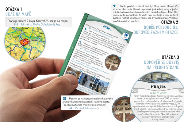 Martina: Propojuje více smyslů a informací najednou. Nejdříve musím najít konkrétní město na mapě. Pak z mapy vyčíst, jak se k němu nejrychleji či nejtaktičtěji dostanu. Následně získám k tomuto městu kartičku, která je doplněna ilustrovaným obrázkem (ten už tak trochu napovídá, čím je město známé - např. Pardubice: dostihy a perník). Ještě jsem nedostala otázku a už vím, kde město leží, která města jsou v jeho okolí a co je pro město typické.