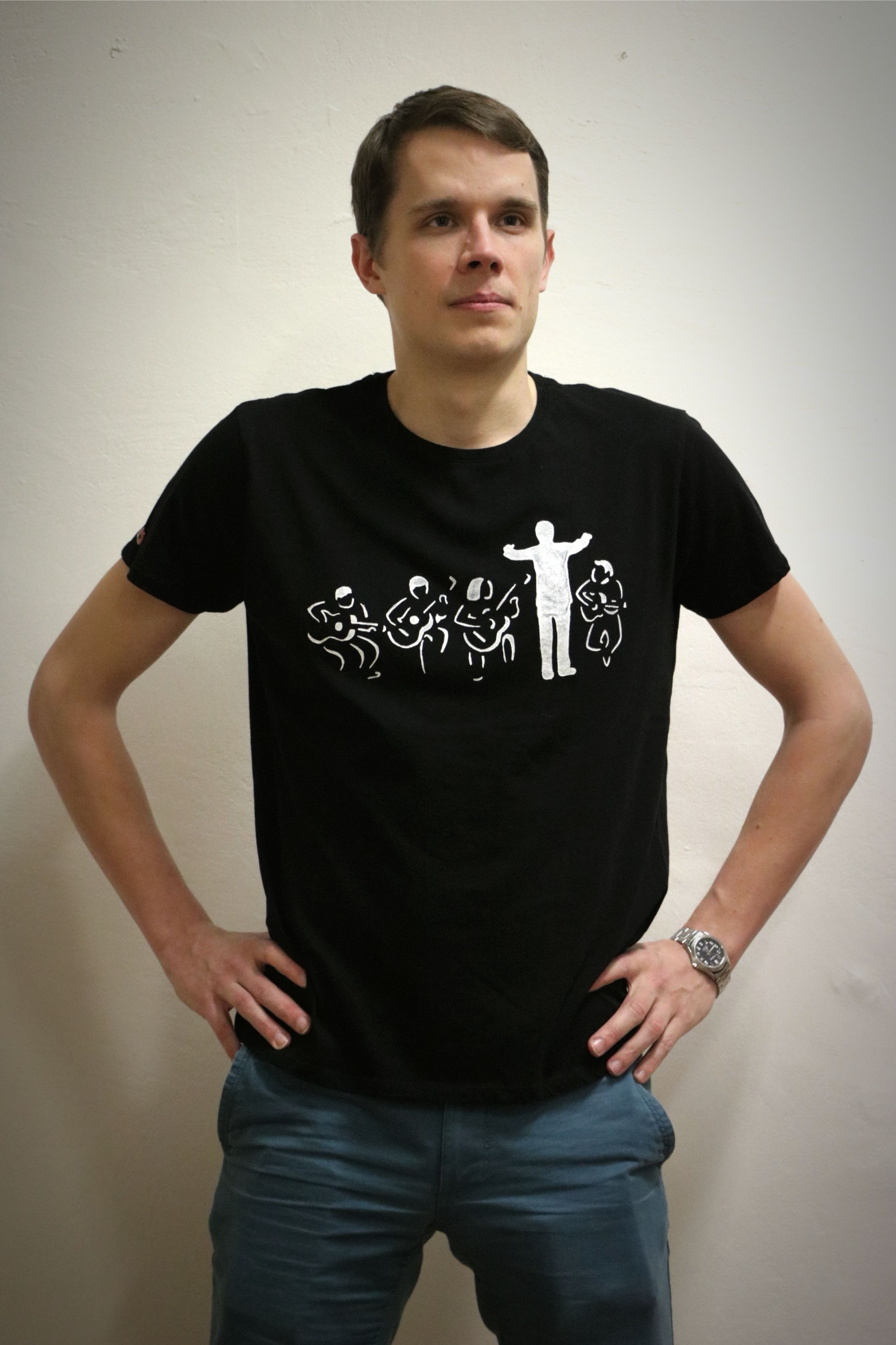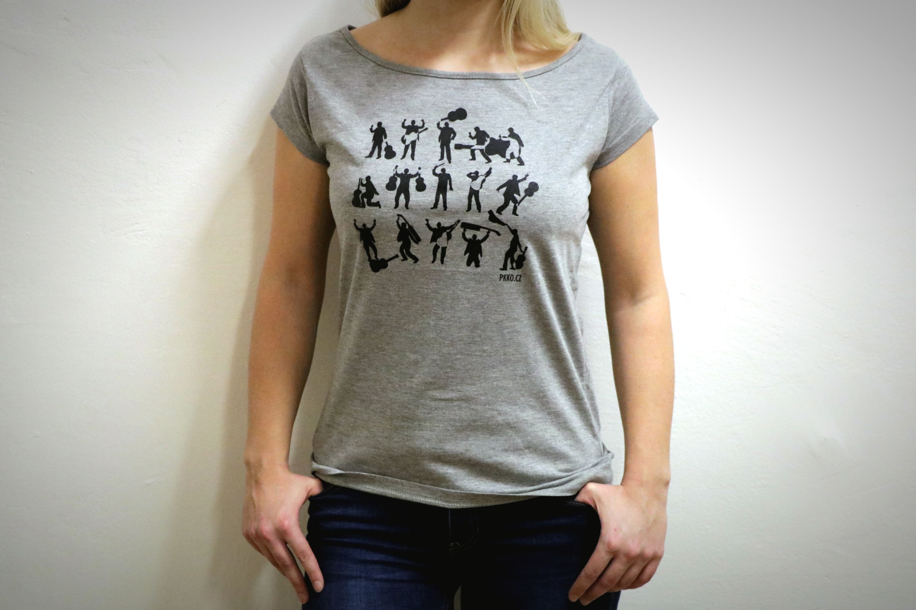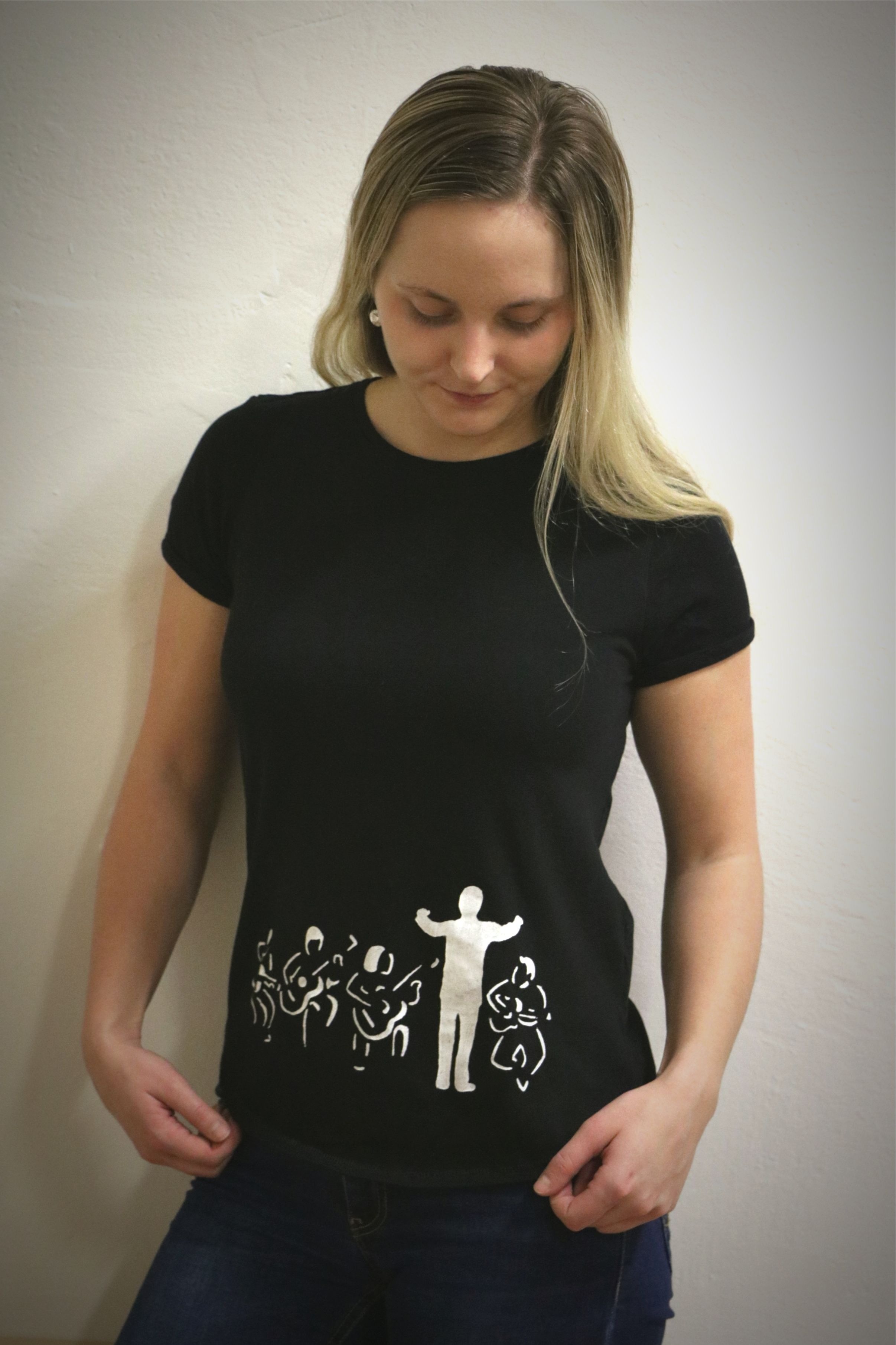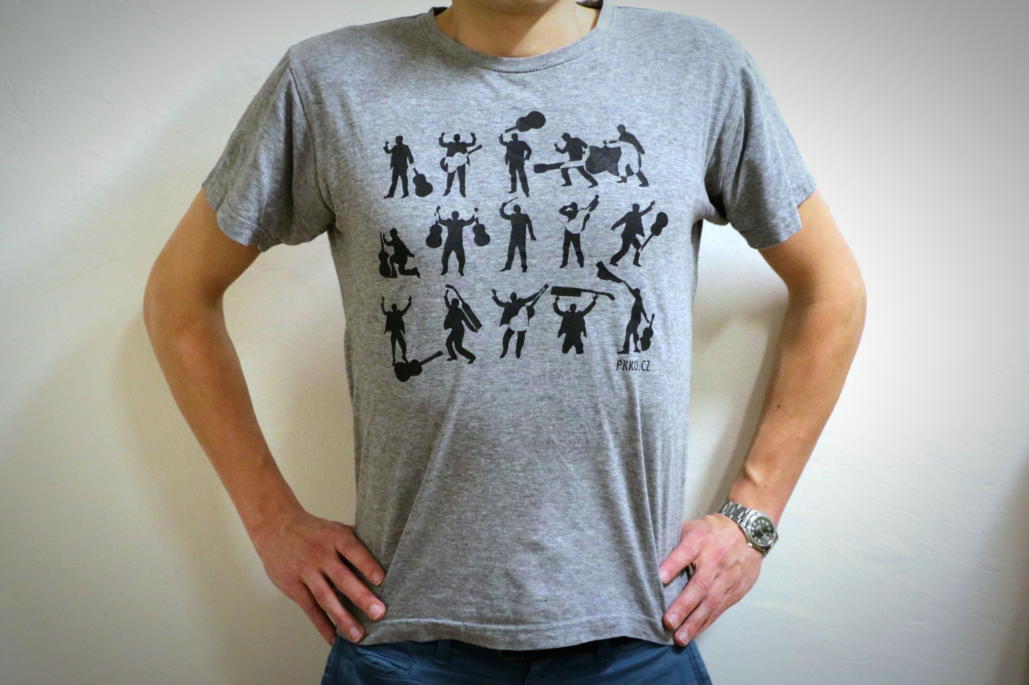 Zaznamenali jsme velký zájem o naše trička, proto se v příštích dnech budeme snažit přidat více kusů. Abyste nekupovali zajíce v pytli, přikládáme fotky, kde si trička můžete prohlédnout a vybrat favorita :-) Na černá tiskneme obrázky poctivě ručně, proto nebude problém udělat drobné změny (např. umístit potisk na dámském tričku na prsa). Navíc jsou na něm reální členové našeho orchestru- schválně kolik jich poznáte!