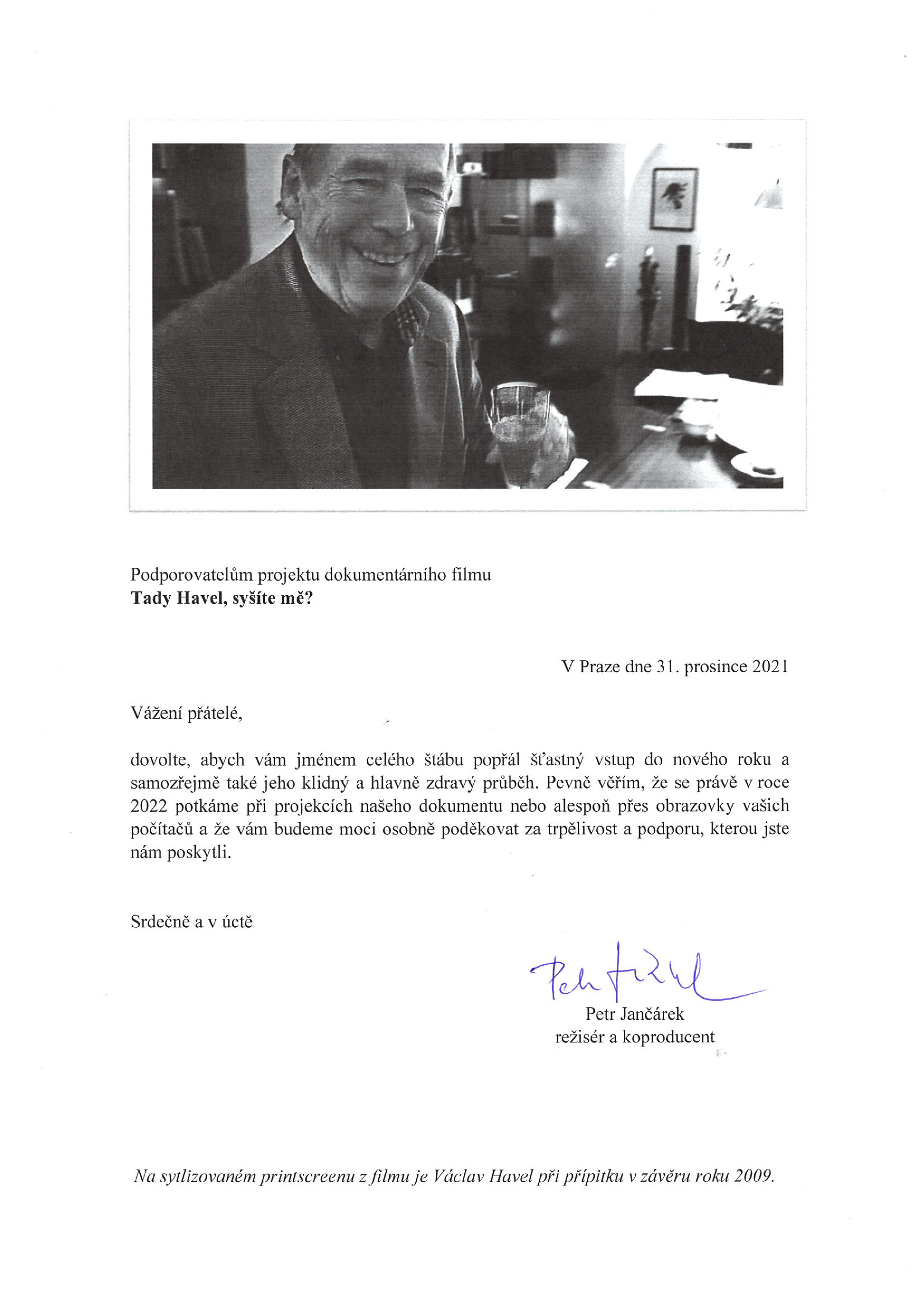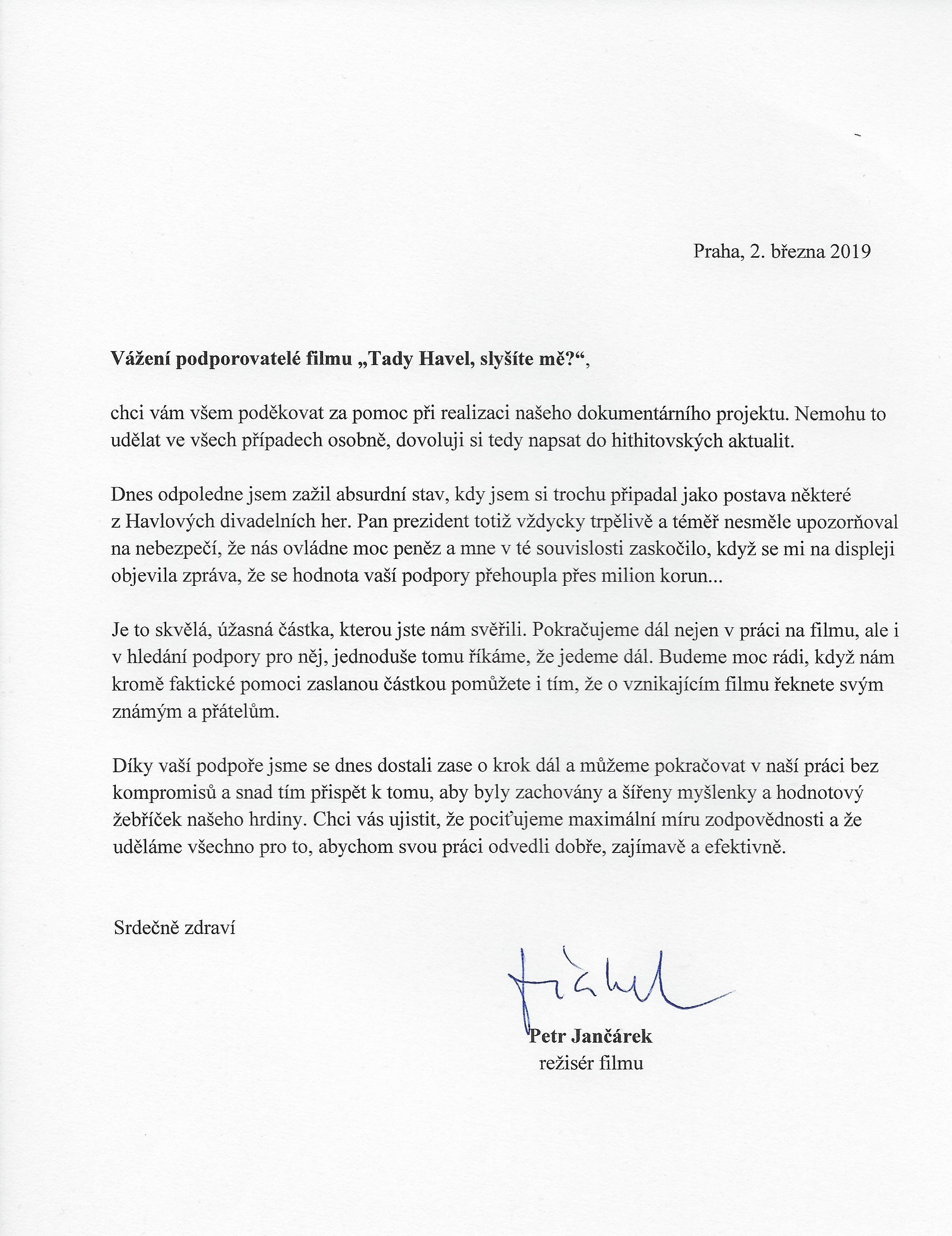 Jsme nesmírně vděční, že jste s námi před lety vykročili na krásnou, ale složitou a dobrodružnou cestu, spojenou s dokončováním našeho dokumentu. A také za to, že jste s námi vydrželi, jak se tak říká, v dobrém i ve zlém. Stojíme dnes na prahu důležitého milníku – blíží se premiéra filmu, který v sobě nese nejen duchovní dědictví Václava Havla ale i inspiraci pro každého z nás.