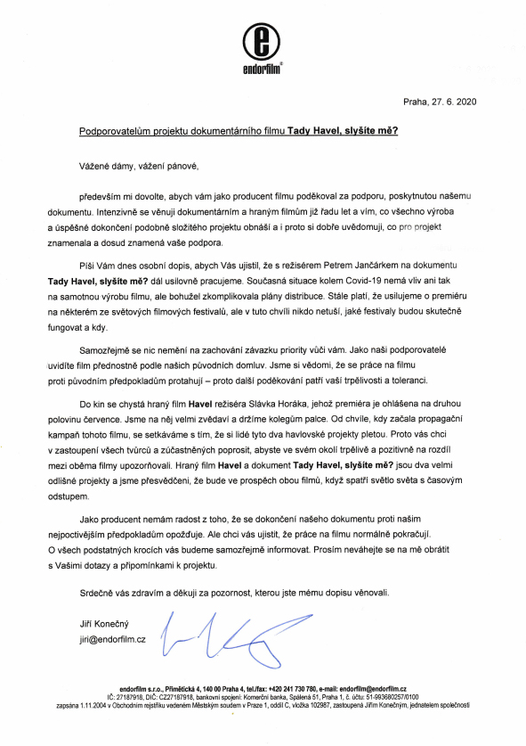 Samozřejmě platí všechny naše závazky vůči vám. Píšu ale proto, že jsme se začátkem války na Ukrajině dostali nový archivní materiál, který nás překvapil a nadchl natolik, že přece jen uvažujeme o změně a malé úpravě filmu: díky spolupráci s Knihovnou Václava Havla máme k dispozici videopozdrav Václava Havla z roku 2004 a jsem přesvědčen, že po jeho zhlédnutí budete souhlasit, že by byl hřích se nepokusit jej do filmu dostat. I s vědomím, že se nezachoval v dobré techické kvalitě. KVH jej aktuálně publikovala na svém FB, vám je pod následujícím odkazem k dispozici v plné verzi.