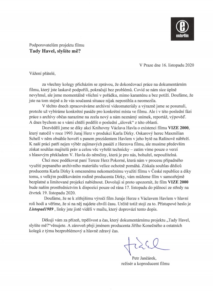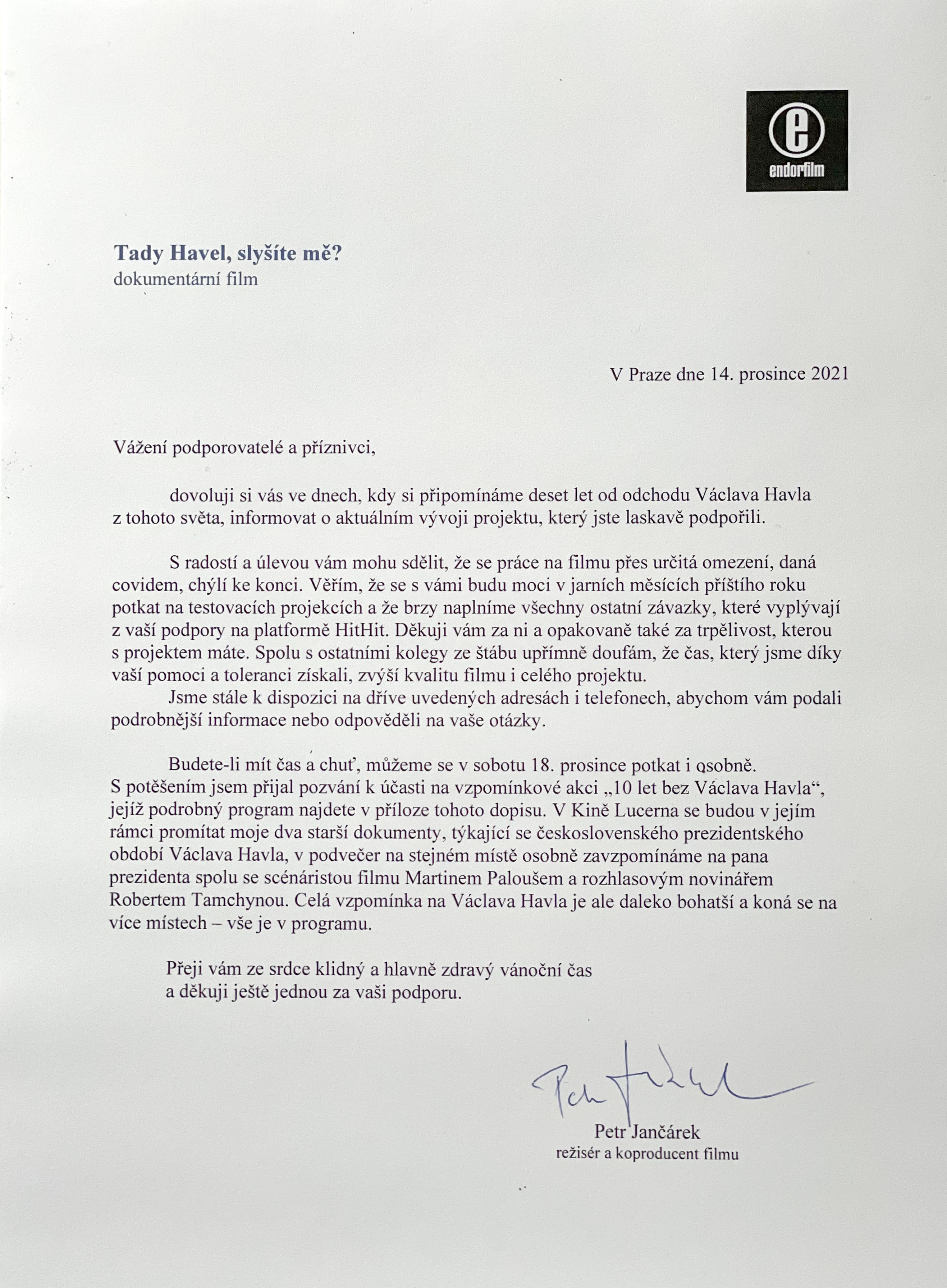 Milí přátelé a podporovatelé projektu dokumentárního filmu Tady Havel, slyšíte mě?