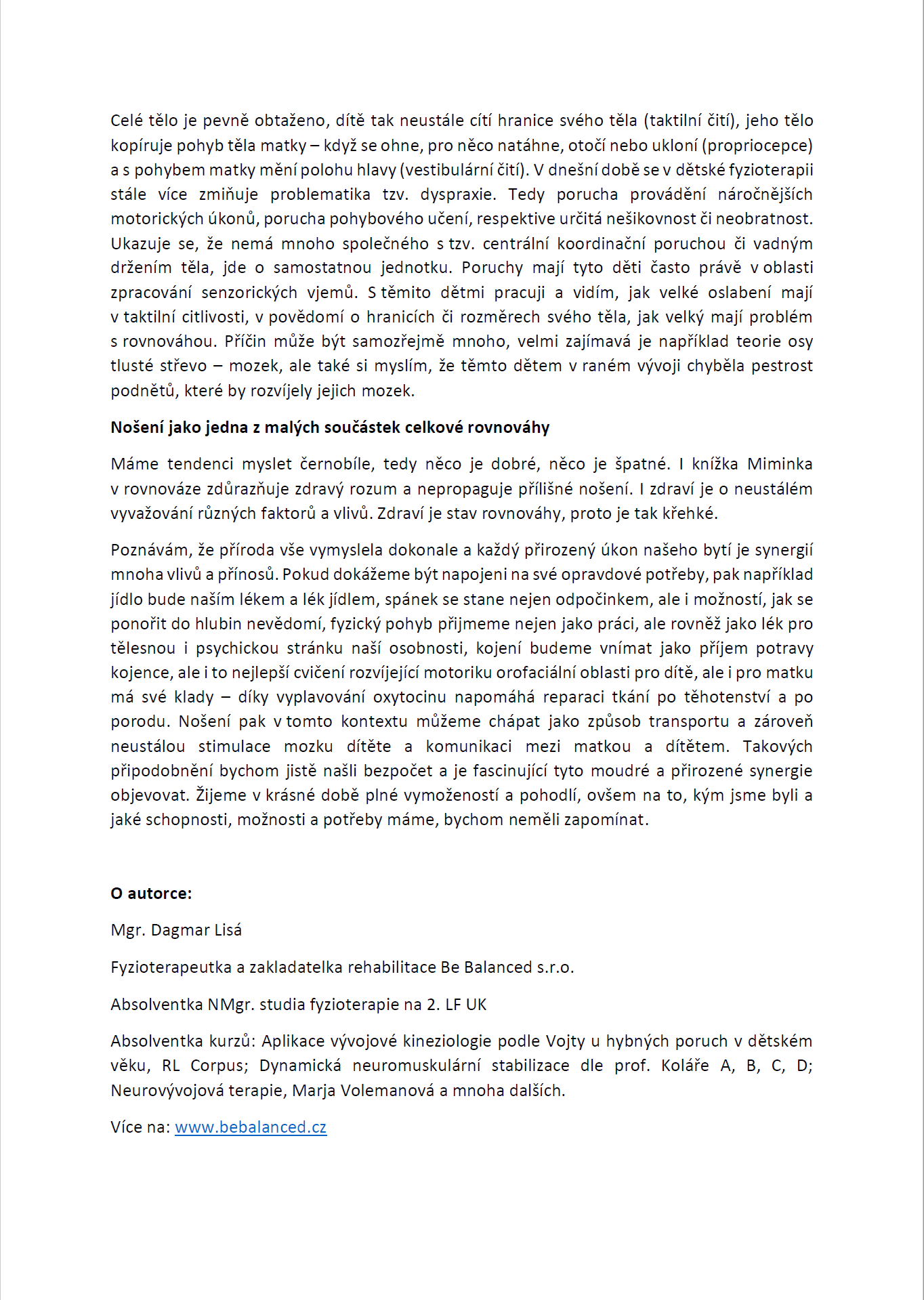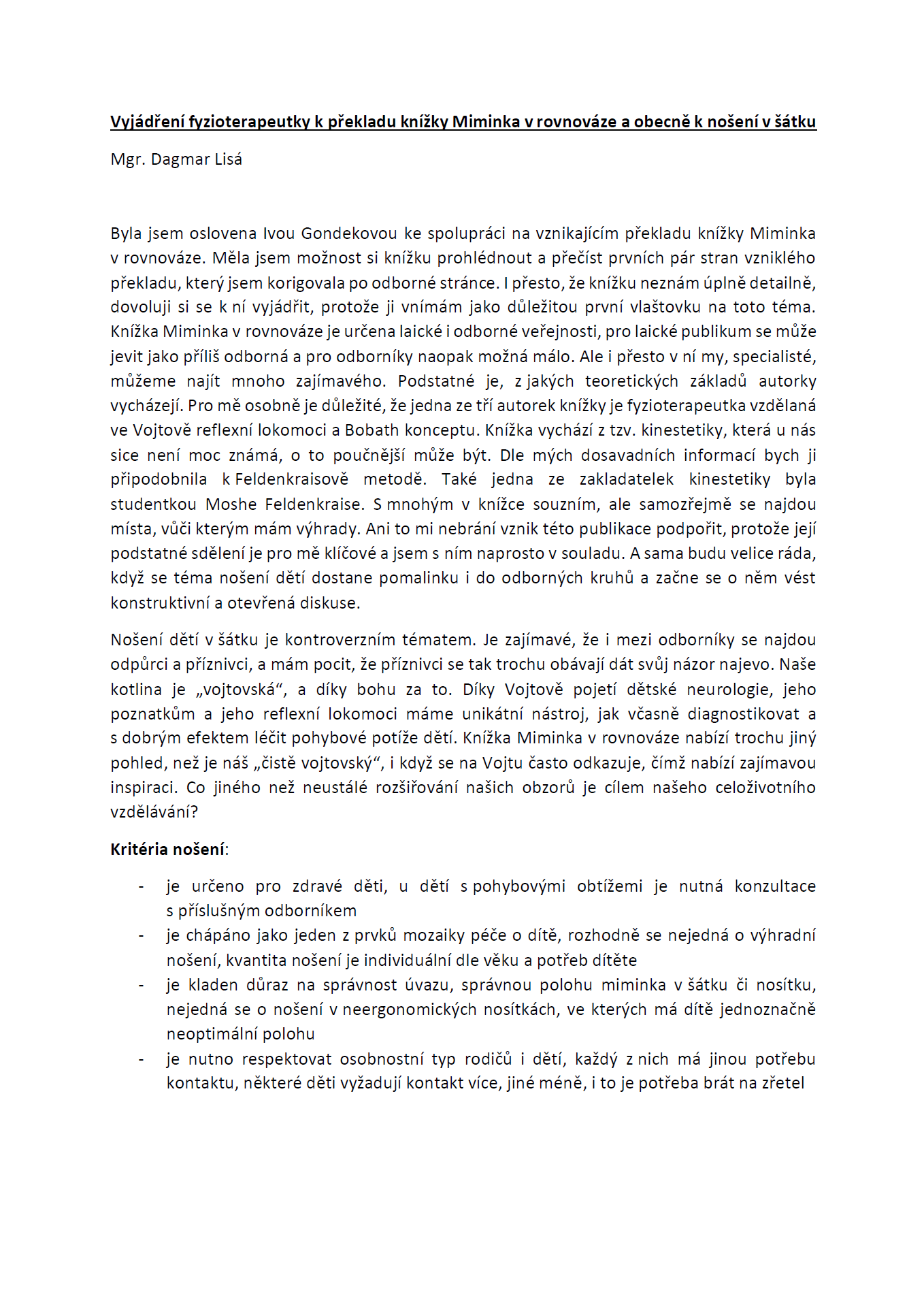 Nyní přinášíme vyjádření Mgr. Dagmar Lisé, fyzioterapeutky a zakladatelky centra Be Balanced, která se s knihou Miminka v rovnováze – nošení dětí podle poznatků fyzioterapie seznámila a spolupracuje i na odborné korektuře překladu.