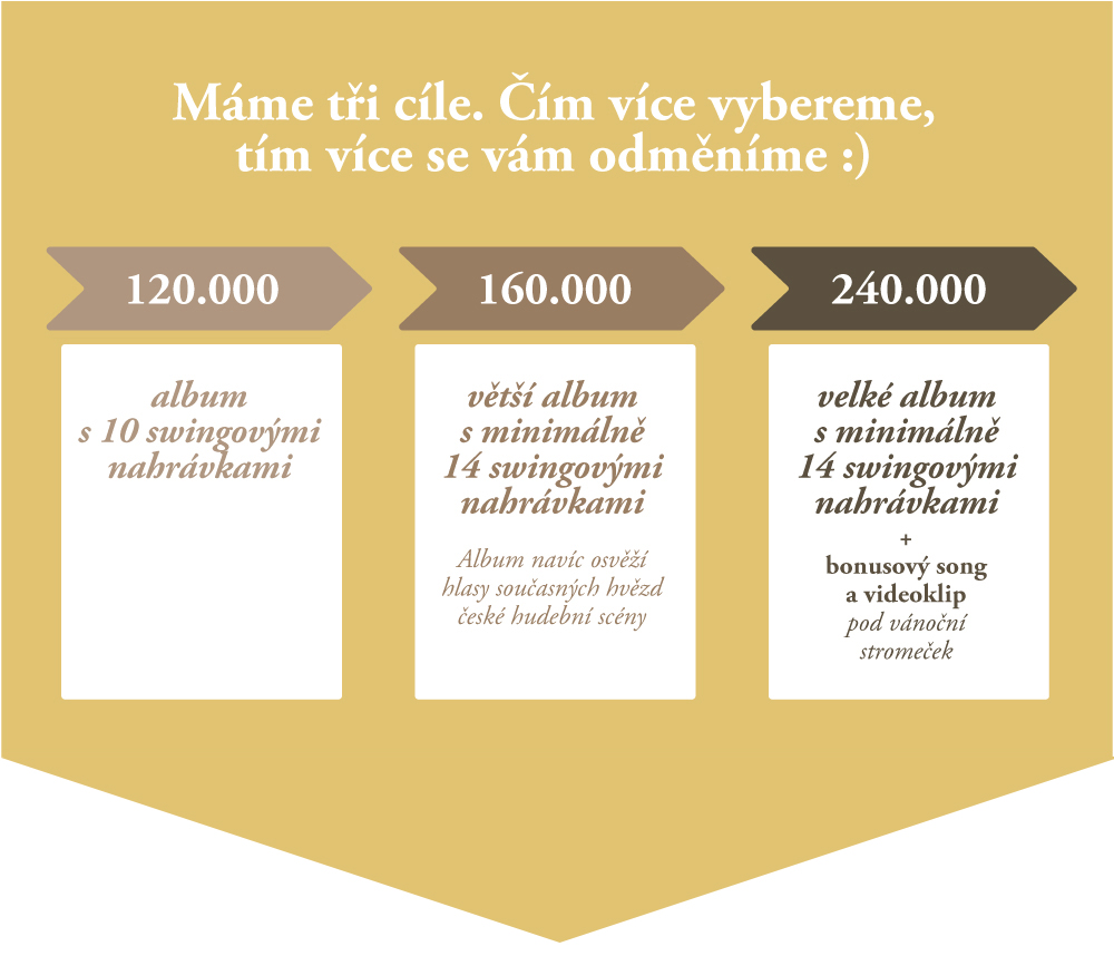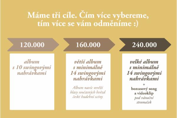 Abychom vás mohli doprovodit i při vašich prvních swingových krůčcích v obýváku, nebo na akcích, kam se za vámi nedostaneme, musíme své hlasy a nástroje zvěčnit. Potřebujeme tedy dostatek cinkátek na nové aranže a kvalitně natočené CD ve studiu, ať všechno zní, jak se patří! Jdete do toho s námi?