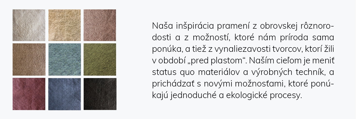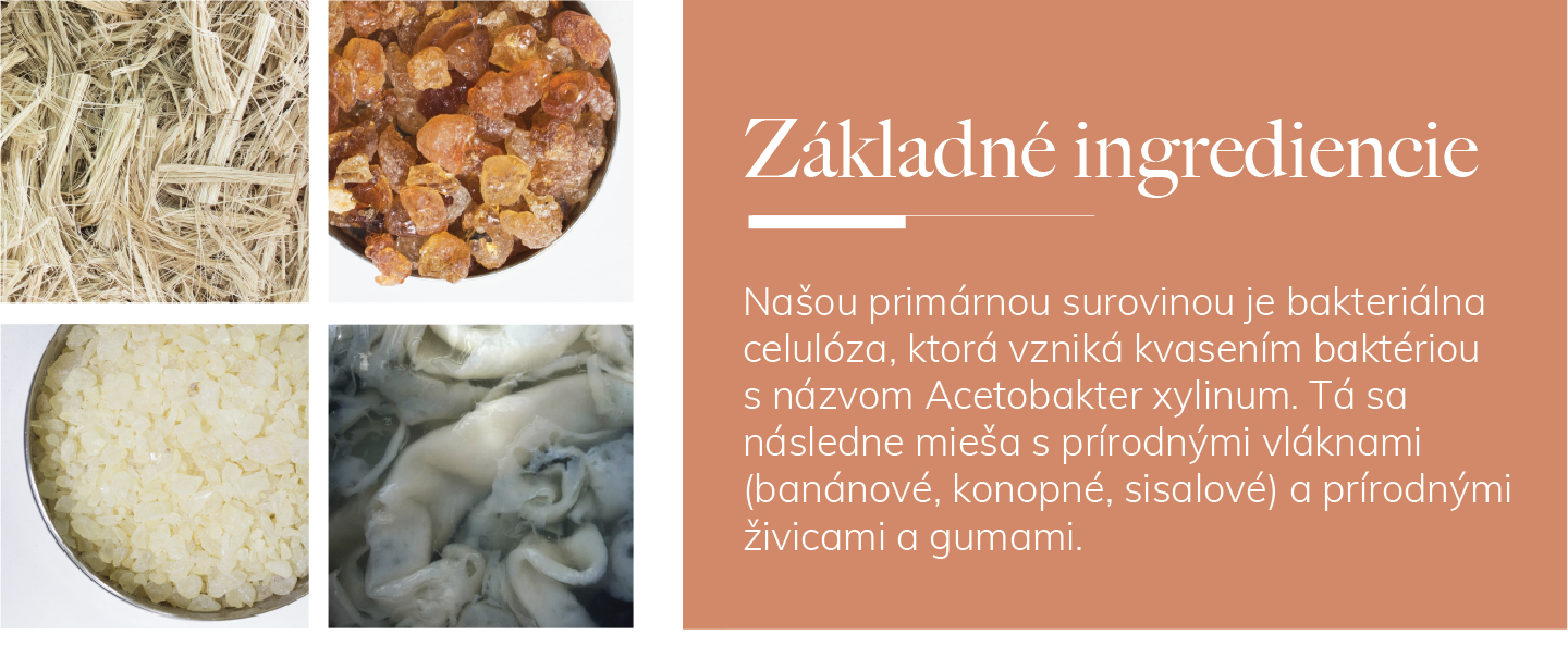 Výber našich základných surovín nie je náhodný – starostlivo sme ho preskúmali a testovali na stovkách pokusov a omylov. Každá zložka je dôležitá a rozhoduje o výsledných vlastnostiach materiálu. Naším záväzkom je však nepridávať nič na báze ropy, pretože chceme, aby bol náš materiál kompostovateľný – koniec sme teda navrhli už na začiatku:).