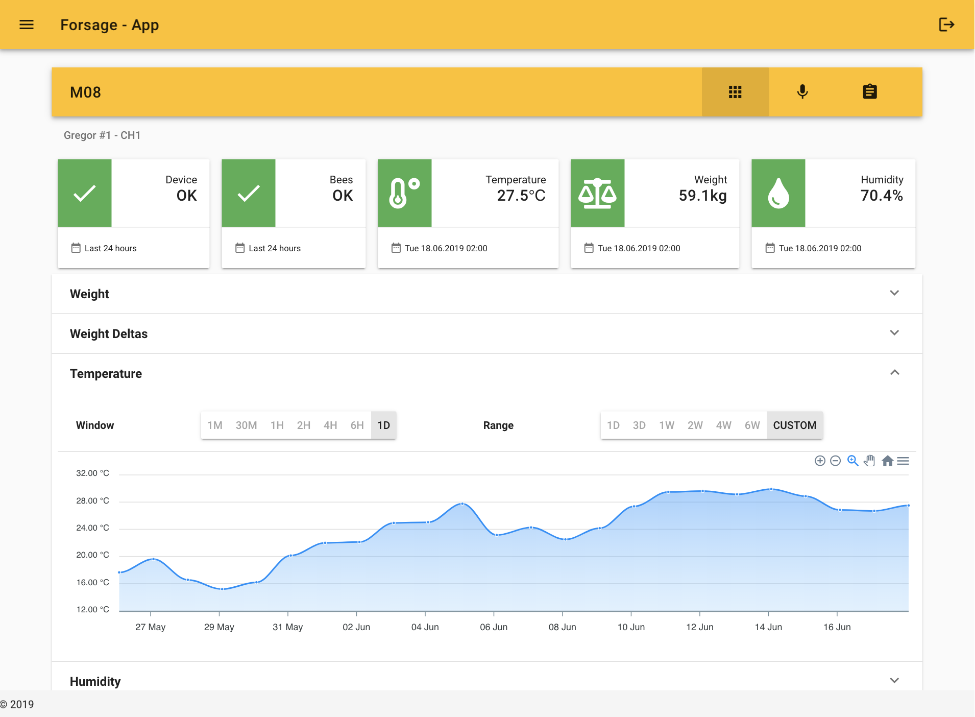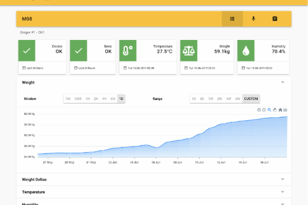 Ta je přístupná jak z počítače, tak z mobilu. Včelař v reálném čase sleduje dění v úlu (váhový přírůstek medu, úbytek zásob, stres včel aj.). Vidí také historii v úlu.