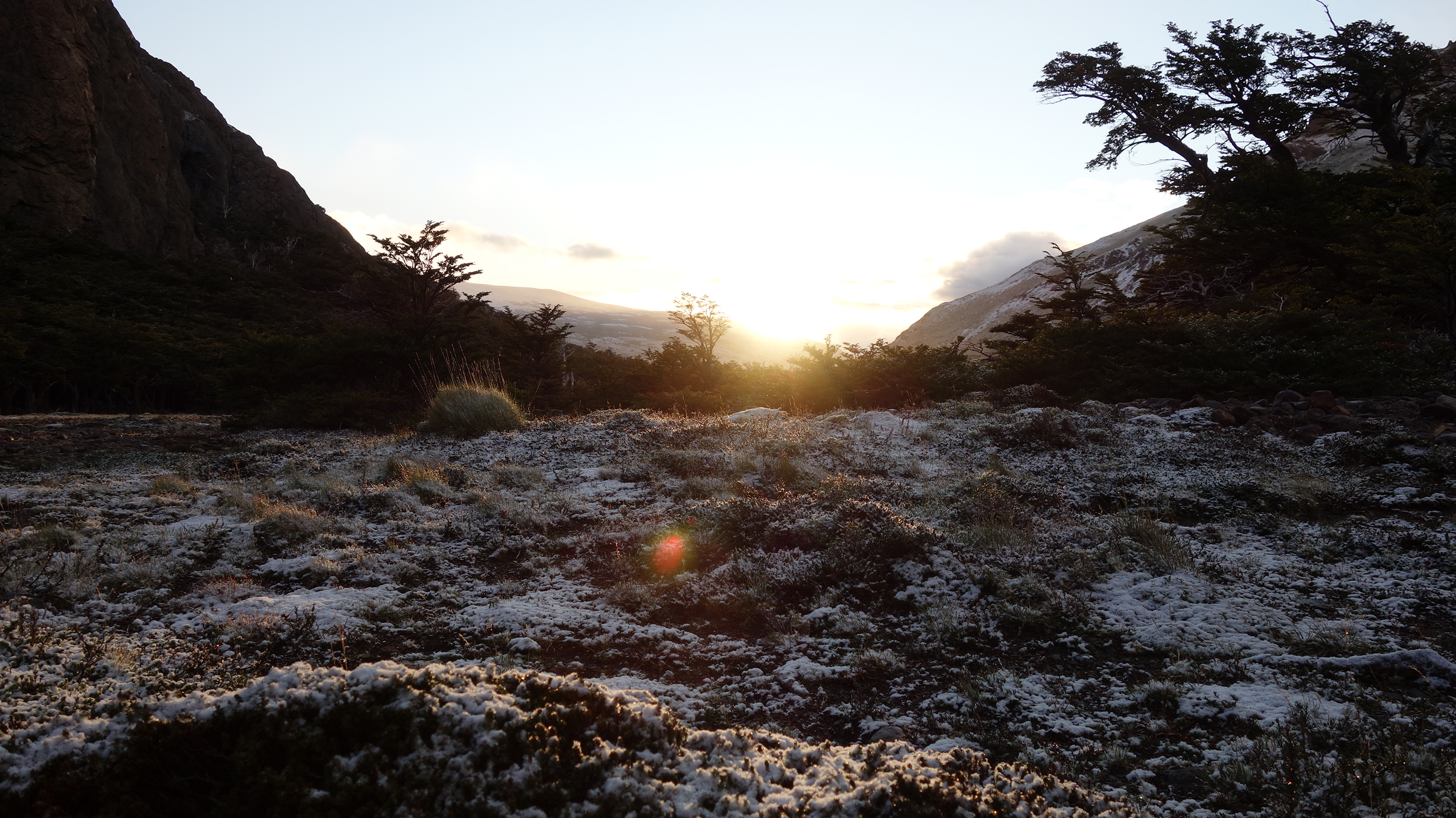 Naše obavy sa naplnili. Nad ránom ma prebúdza sneh padajúci na stan. Navliekam na seba mikinu, páperovú bundu a spím ďalej. O siedmej ráno je všetko okolo nás biele a obloha dokonale modrá. Slnečné lúče sú síce stále schované za kopcami, no pripravené každú chvíľu poslať mráz a chlad do zabudnutia. Dovtedy ma zo stanu nedostane ani stádo volov.