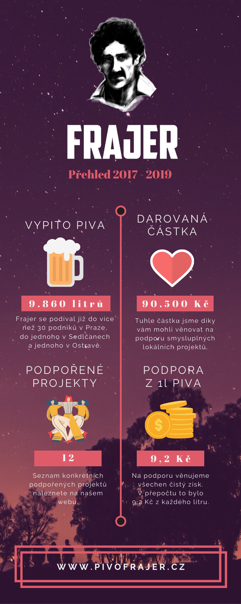 Tím, že Frajera pijete, se podílíte na tom, že téměř všechen zisk z našeho piva jde totiž po uhrazení provozních nákladů právě na podporu společensky prospěšných nebo kulturně laděných projektů sociálního charakteru. Právě takových, které jste teď před pár hodinami sami vymysleli, a nebo rovnou na ten váš jedinečný projekt. A to je super.