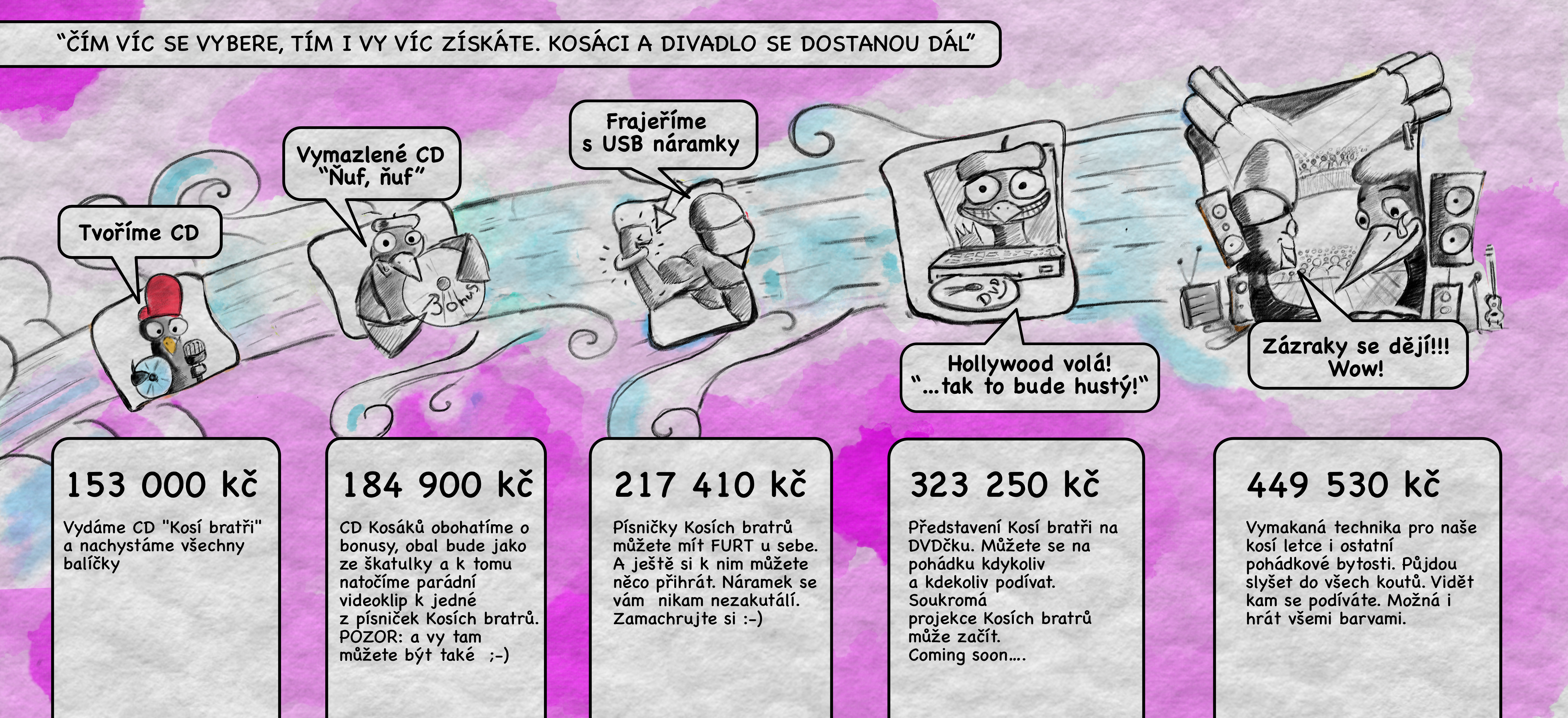 Pojďme spolu zpívat, tančit a bavit se, co nám síly stačí. Divadlo Scéna pro vás touží připravit CD s písničkami z inscenace Kosí bratři. Chceme přinést radost a pohodu do vašich domovů. Podívejte se, co si přejeme, s vaší pomocí, pro vás a děti vytvořit.