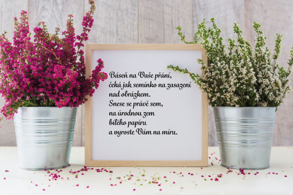 Ke sbírce Vám složím tématickou báseň, která bude určena jen Vám nebo Vašim blízkým – k narozeninám, svatbě, z lásky nebo jen tak pro radost (dle individuální dohody). Báseň obdržíte jako obrázek v elegantním dřevěném rámečku bílé barvy (21x21 cm). Poštovné je zahrnuté v ceně.