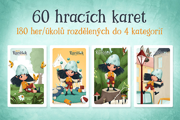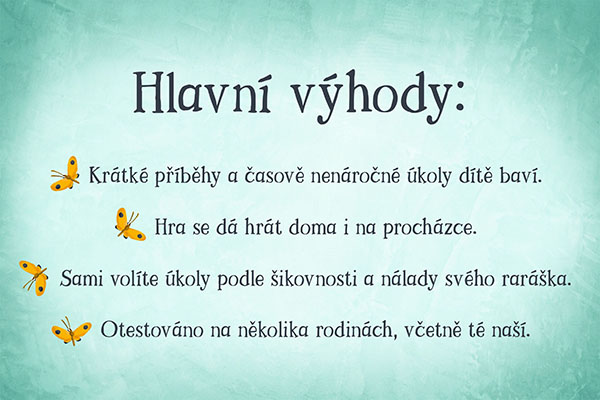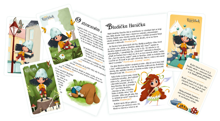Máme doma dva rarášky (tři roky a jeden rok) a tak jsme stále přemýšleli, jak staršího z nich zabavit, bez použití mobilu nebo počítače. Výsledkem je dětská hra skládající se z 12 poutavých krátkých pohádek, do kterých se dítě aktivně zapojuje, a sady 60 herních kartiček se 180 úkoly (tři úkoly na každé kartičce pro možnost výběru).